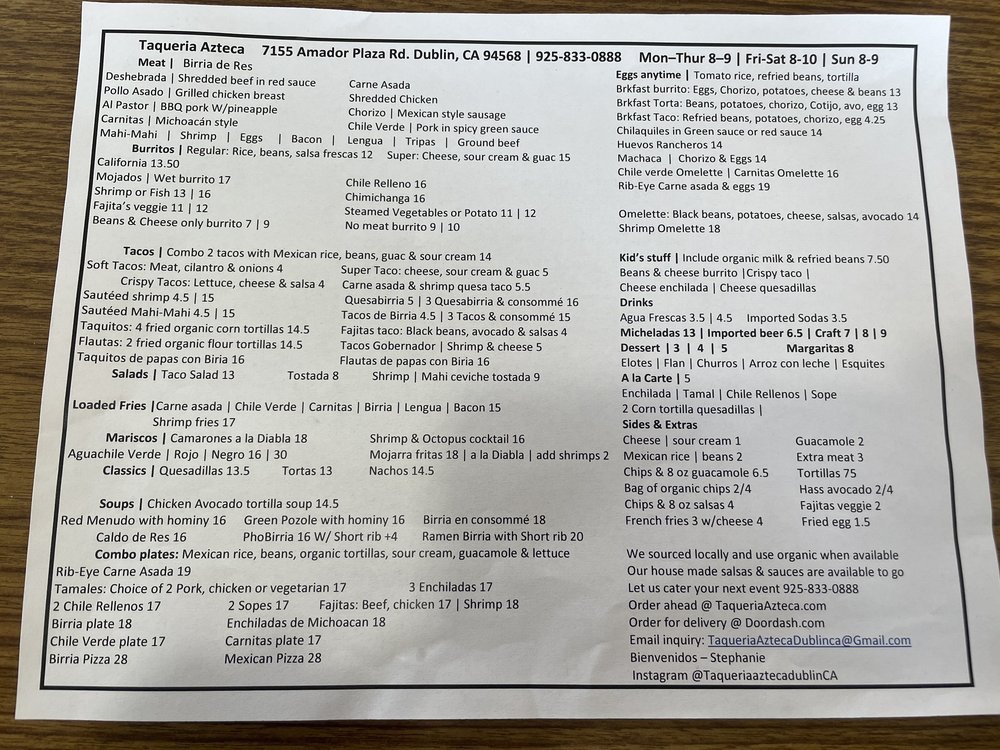 Taqueria Azteca, located in Dublin, CA, offers a vibrant Mexican dining experience. With a diverse menu featuring dishes like barria ramen, taco salad, and Short Rib PhoBirria, customers rave about the generous portions and flavorful ingredients. The self-serve chips & salsa bar adds an interactive touch, and the clean interior and outdoor seating create a welcoming atmosphere. Customer reviews highlight the delicious food and affordable prices, making it a go-to spot for lunch or dinner. Whether you're in the mood for tacos, pizza, or traditional Mexican dishes, Taqueria Azteca has something for everyone. Don't miss the opportunity to try their unique offerings and experience the authenticity of their cuisine.